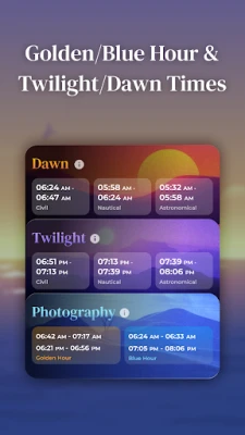 Moon Phases & Sun Calendar avab teie ees taevalaotuse saladused, pakkudes terviklikku ülevaadet Kuu faasidest, päikesetõusu ja -loojangu aegadest, kuldsest ja sinisest tunnist, sodiaagimärkidest ning muudest olulistest taevasündmustest. Olenemata sellest, kas järgite Kuu tsükleid oma igapäevaelus, olete kirglik fotograaf, kes otsib täiuslikku valgust, või lihtsalt naudite teadmisi taevakehade liikumisest – see rakendus koondab usaldusväärse ja täpse Kuu ning Päikese informatsiooni ühte elegantsesse ja kergesti kasutatavasse vormi, iga kuupäeva ja asukoha jaoks.
