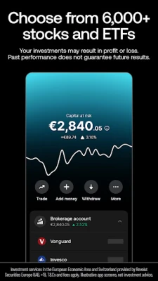 Lisaks igapäevastele tehingutele võimaldab Revolut sul sujuvalt raha saata ja vastu võtta, olenemata asukohast. Saada või küsi üle 30 valuutas raha vaid mõne puudutusega, vestle ja tee ülekandeid – kõik ühes kohas. Jagage arveid sõpradega hõlpsasti ja unusta piinlikud rahavestlused, lisades vajadusel lõbusa GIF-i. Revolut avab ka uksed investeerimismaailma: alusta aktsiatega kauplemist alates 1 eurost, valides üle 2000 aktsia hulgast maailma juhtivate ettevõtete seas. Naudi igakuiselt teatud ulatuses vahendustasuvabu aktsiatehinguid ja süvenda oma teadmisi meie õppekursuste ja viktoriinide abil. Pea meeles, et kapital on alati riskiga.