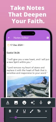 See kristlik märkmikurakendus aitab sul süvendada piiblilugemist ja -uurimist. Tee märkmeid jutlustest või igapäevastest pühendumistest, integreerides piiblisalme otse oma mõtisklustesse. See hõlbustab kristlastele üle maailma piiblimeditatsiooni ja evangeeliumi tähistamist sügavamaks peegeldamiseks.