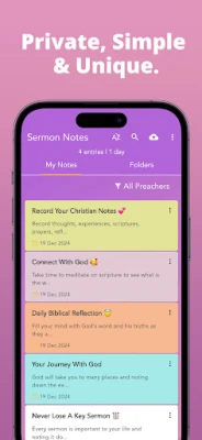 Sermon Notes pakub võimsat funktsionaalsust, mis hõlmab hõlpsat märkmete tegemist kirikuteenistuste ajal, jäädvustades olulisi mõtteid ja pühakirjakohti vaevata. Saate otse oma märkmetesse integreerida Piibli salme, luues rikkalikuma konteksti sügavamaks aruteluks ja isiklikuks mõtiskluseks. Lisaks pakub Sermon Notes võimaluse pidada kristlikku päevikut, kuhu saate talletada oma isiklikud arusaamad, palved ja vaimulikud kogemused. Süsteemne organiseerimine kuupäeva, jutlustaja või teema järgi tagab, et leiate kiiresti üles kõik, mida vajate, ja detailne otsingufunktsioon aitab leida konkreetseid õpetusi või pühakirjakohti hetkega.